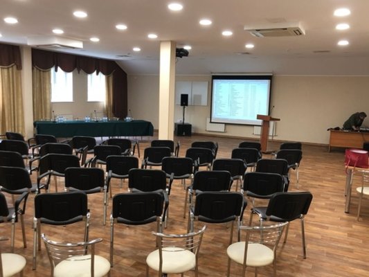 Зал на 100 мест, оборудованный магнитной доской, видеопроектором, большим экраном, трибуной, микрофонами, т.е. всем необходимым для проведения бизнес-тренингов, конференций, совещаний, представительских встреч, специализированных мероприятий.