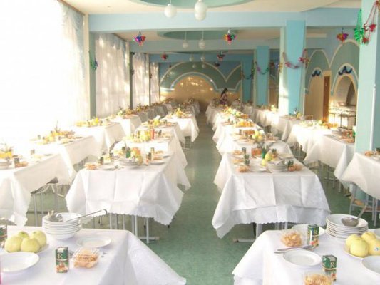 На территории санатория располагается большая и светлая столовая, которая состоит из двух залов, прием пищи осуществляется поочередно, согласно графику. На прием пищи детей приглашают по отрядам.
