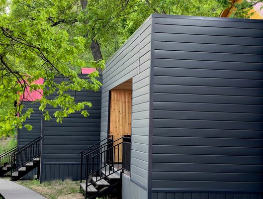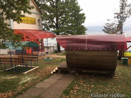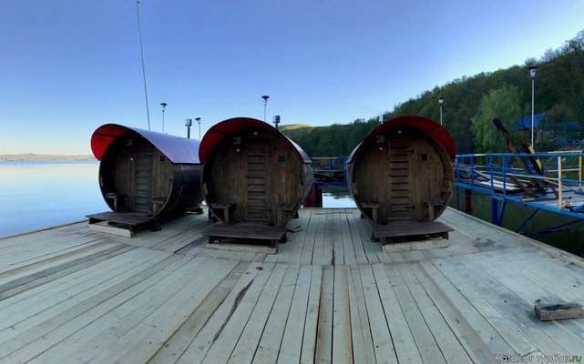 Установлены бани-бочки на воде. После жаркой парной вы можете сразу же окунуться в водохранилище.