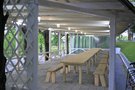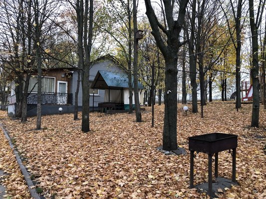 Мангальная зона + площадка для дискотеки/ разных форматов активностей/ фотозоны. В беседке есть свет и розетки. Свой выход к реке и волейбольной площадке.
