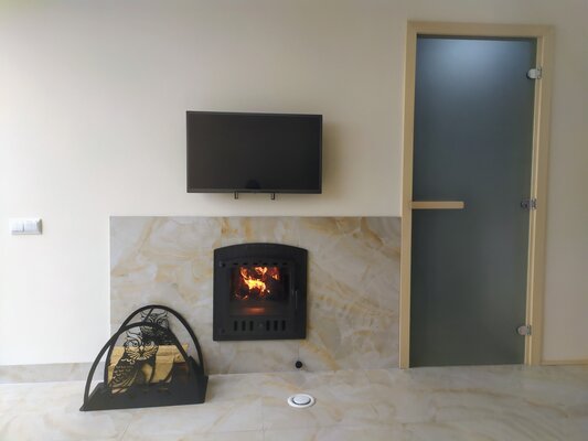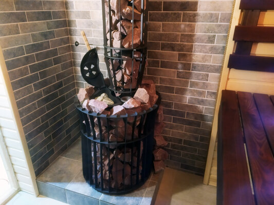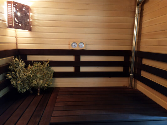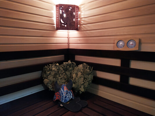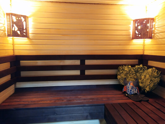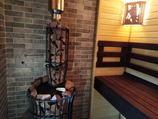 Парная выполнена в лучших традициях, широкие полки, система свежее дыхание, чугунная печь с закрытой каменкой. Печь наполнена жадеитом и обложенная малиновым кварцитом. В парной ароматные лекарственные травы. Во время парения запрещено употреблять алкогольные напитки.