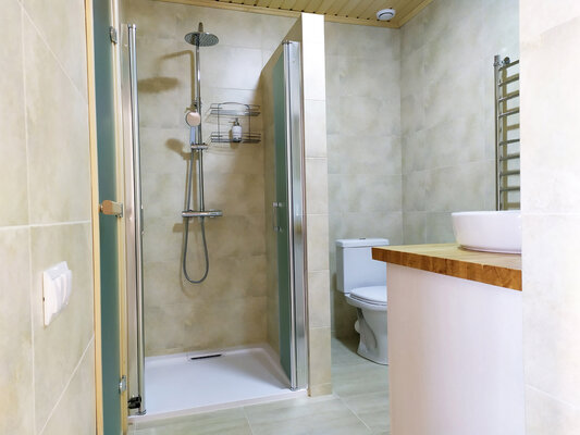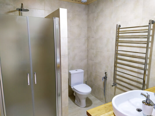 Ванная комната оснащена всем необходимым: душевая кабина с тропическим душем, гигиенический душ, фен, тапочки, полотенца и средствагигиены.