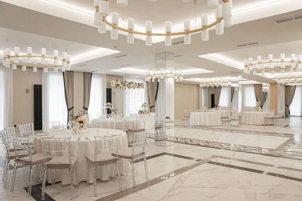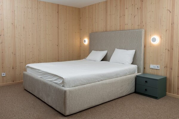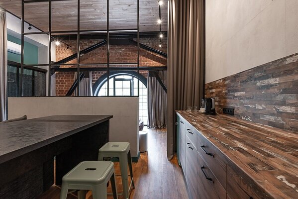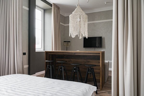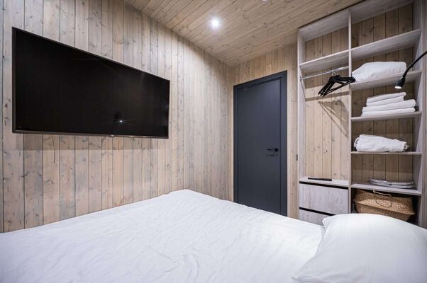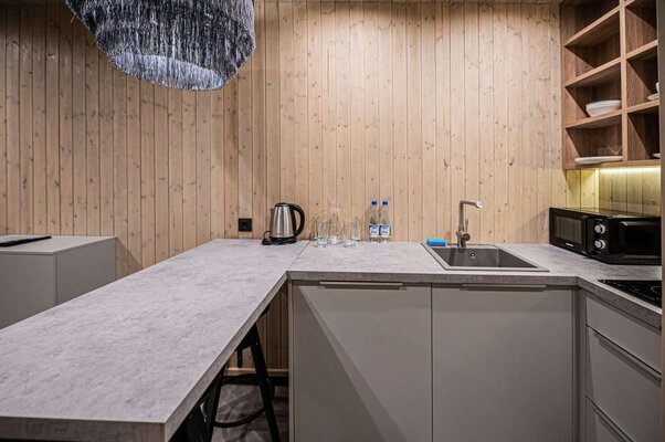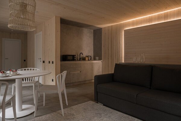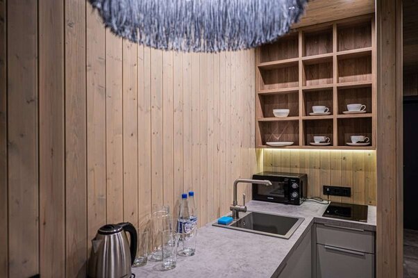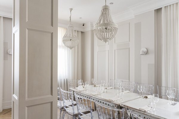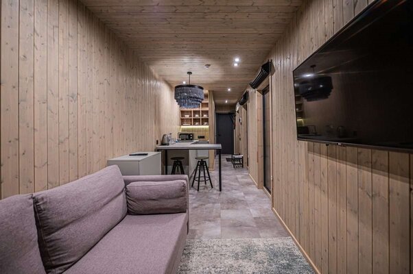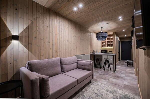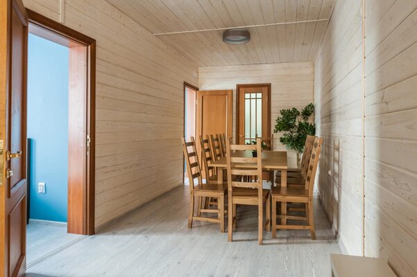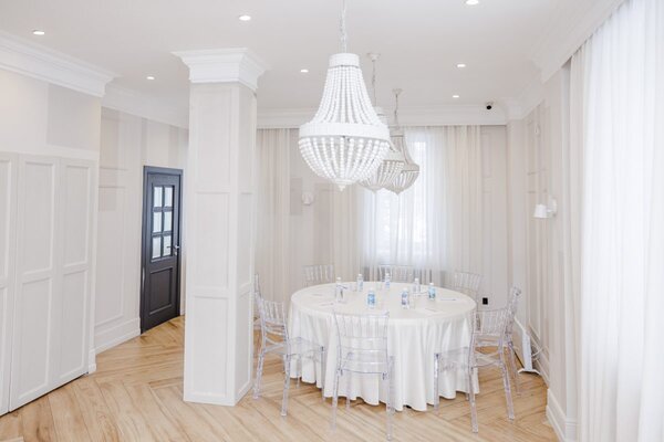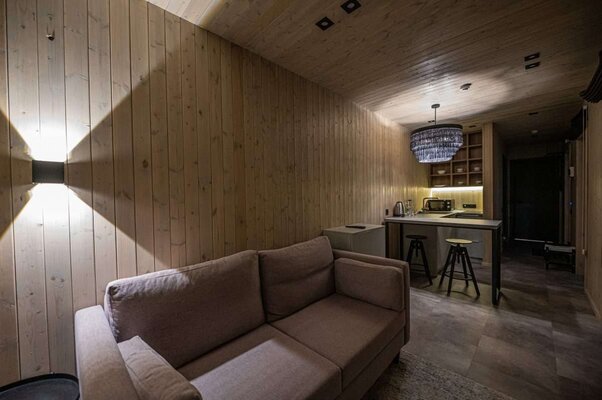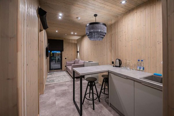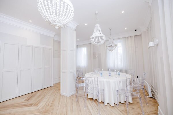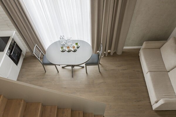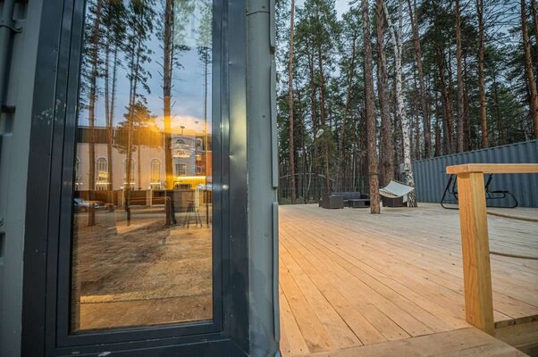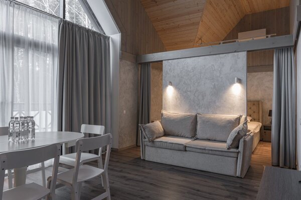Простота и утонченность интерьера не требуют дополнительных декораций, панорамные окна наполняют зал светом и воздухом, а балкон с потрясающим видом на лес станет отличной площадкой для уникальных фотографий.