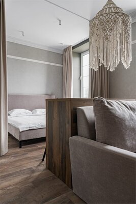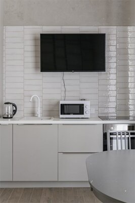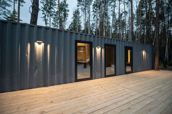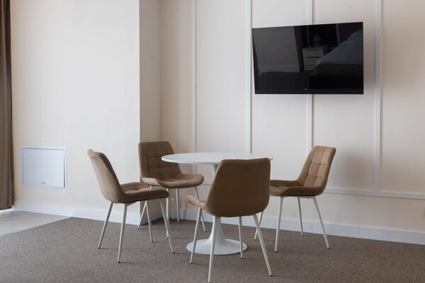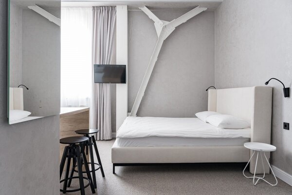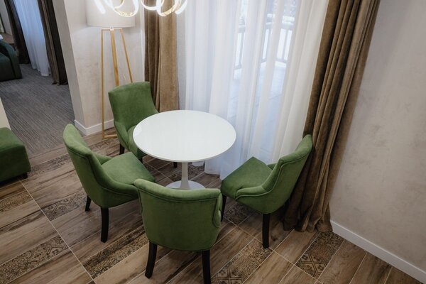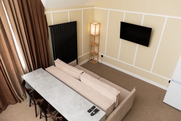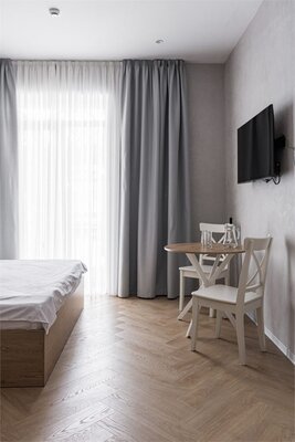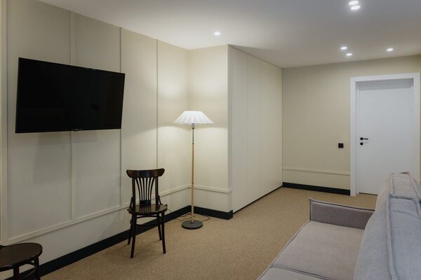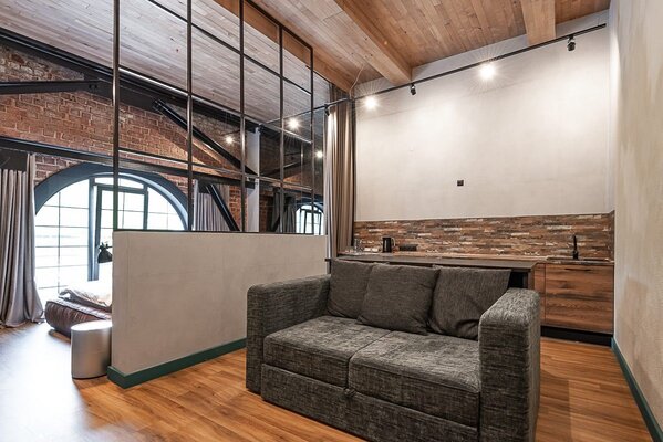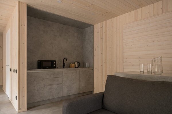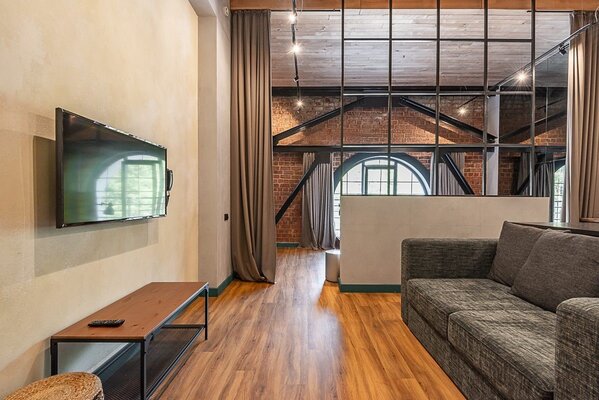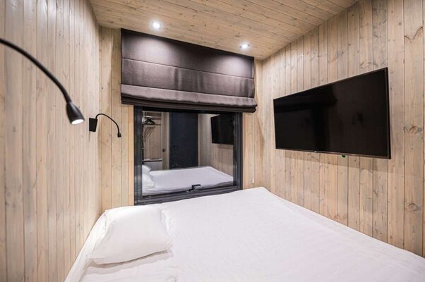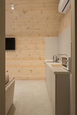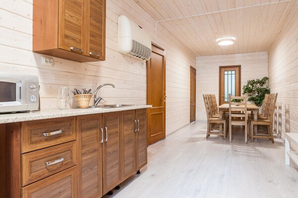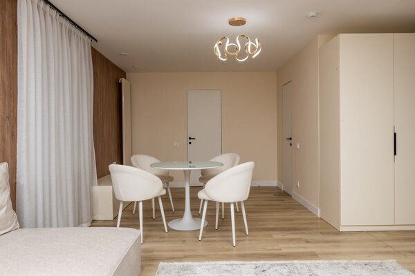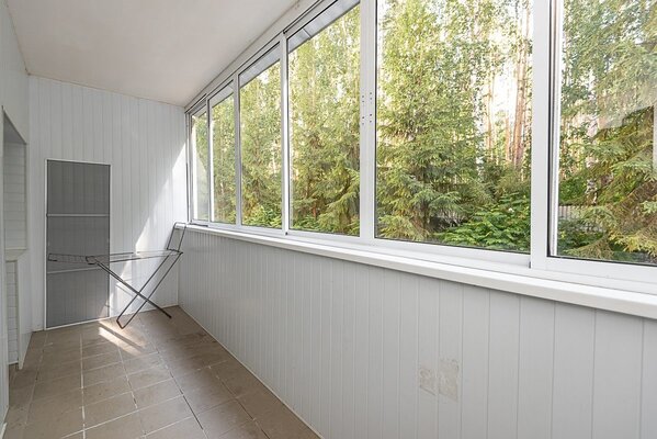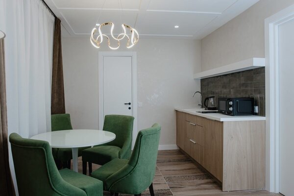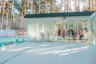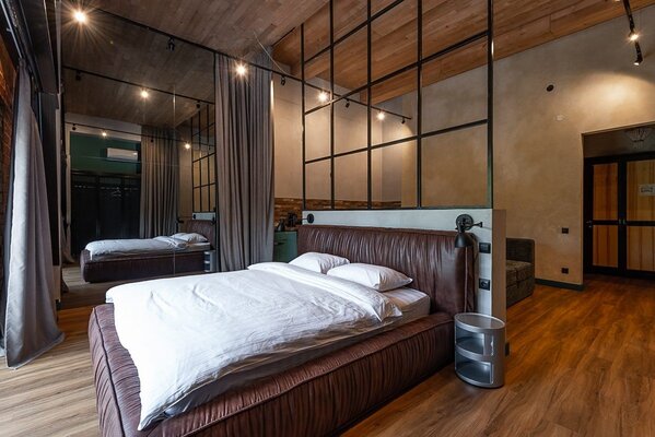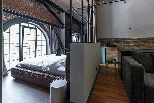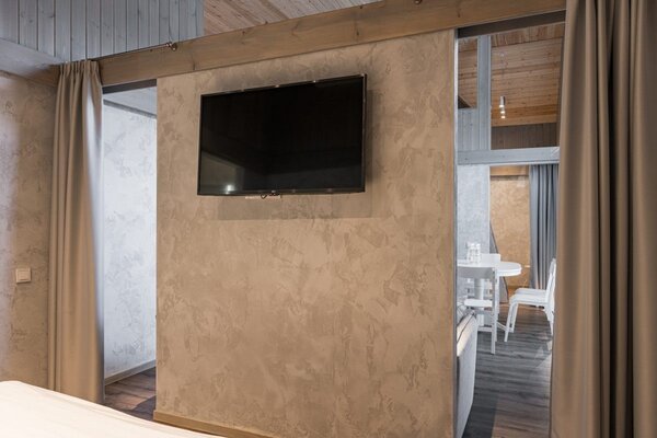Простота и утонченность интерьера не требуют дополнительных декораций, панорамные окна наполняют зал светом и воздухом, а балкон с потрясающим видом на лес станет отличной площадкой для уникальных фотографий.