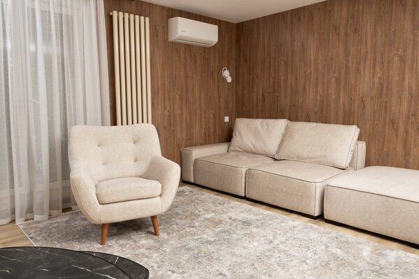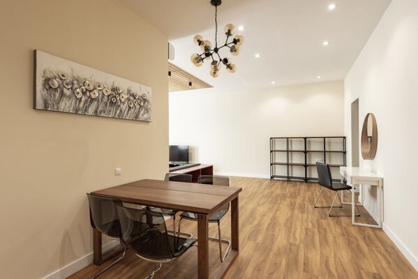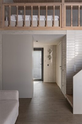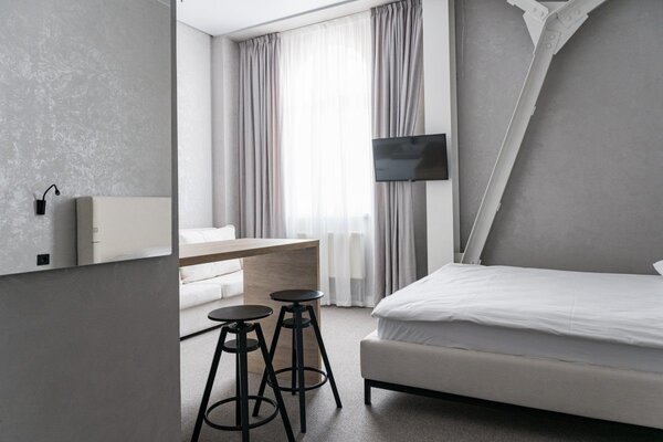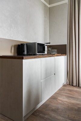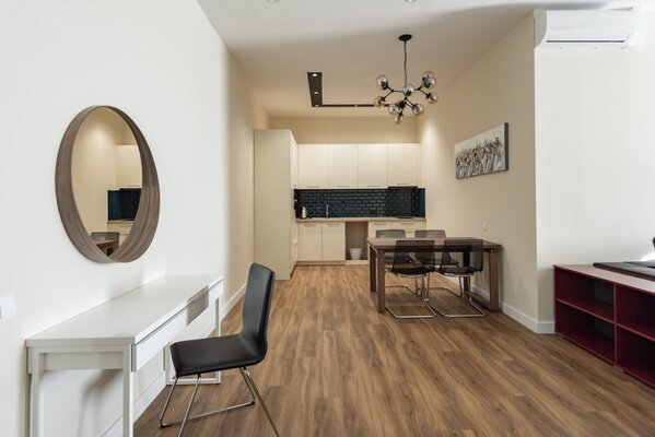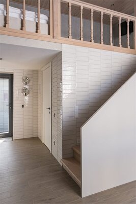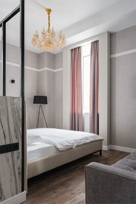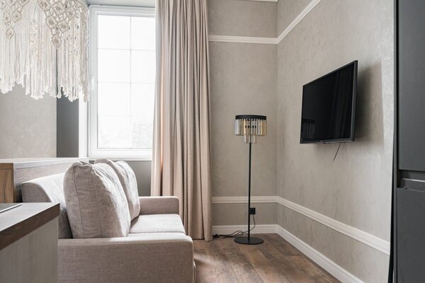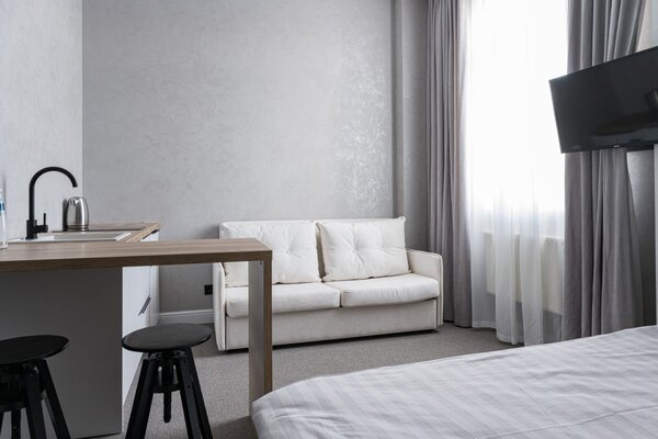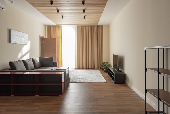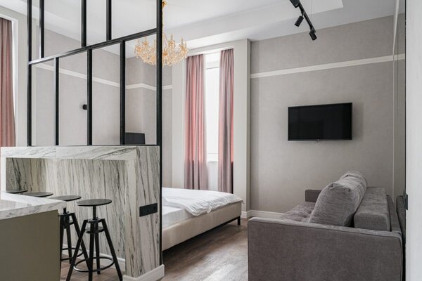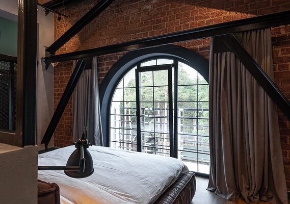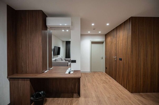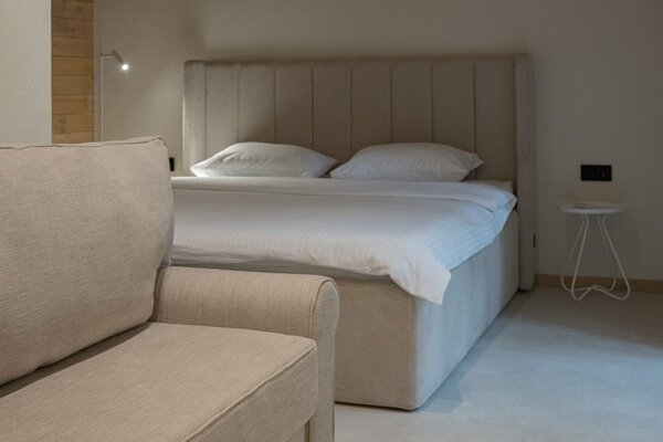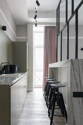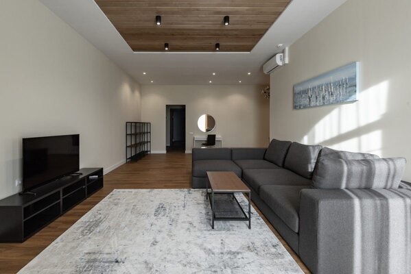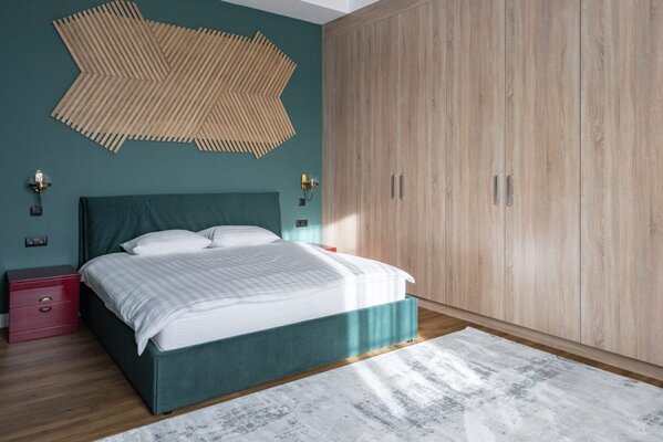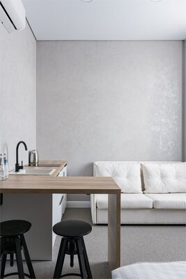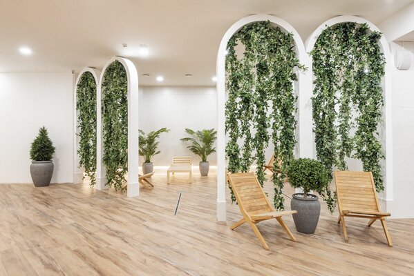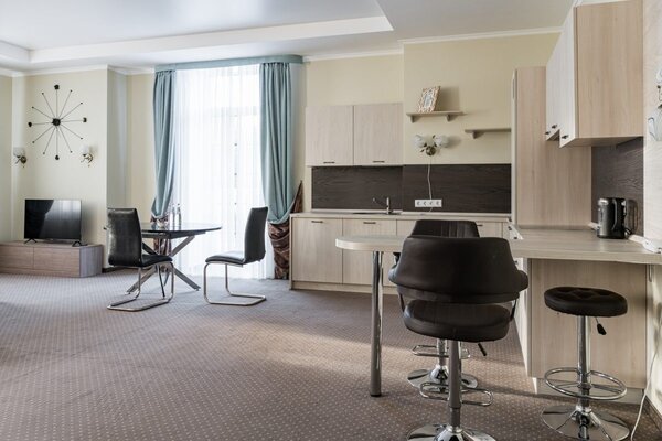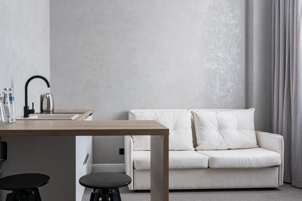 Простота и утонченность интерьера не требуют дополнительных декораций, панорамные окна наполняют зал светом и воздухом, а балкон с потрясающим видом на лес станет отличной площадкой для уникальных фотографий.