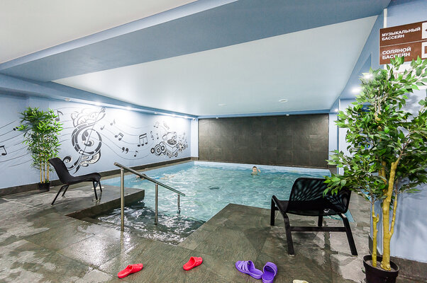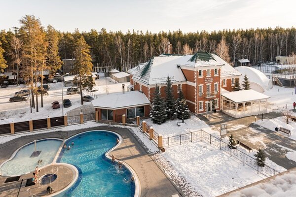 Открытый бассейн имеет постоянную температуру воды, комфортную для зимнего периода, и оптимальную температуру для лета. Минеральная вода поступает из глубинной скважины.