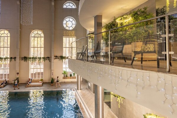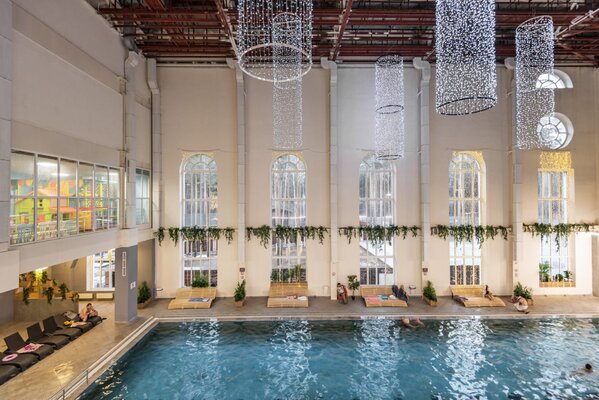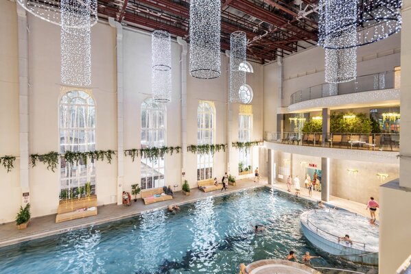 Большой бассейн в теплом помещении, под сводом высоких потолков — отличное место для купания всей семьей.