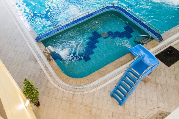 Встроенные массажеры, водопады и зона джакузи — необычные водные развлечения, которые никого не оставят равнодушными. Для маленьких гостей расположена специальная детская зона, с водной горкой, водопадом «Дельфин» и безопасным ограждением.