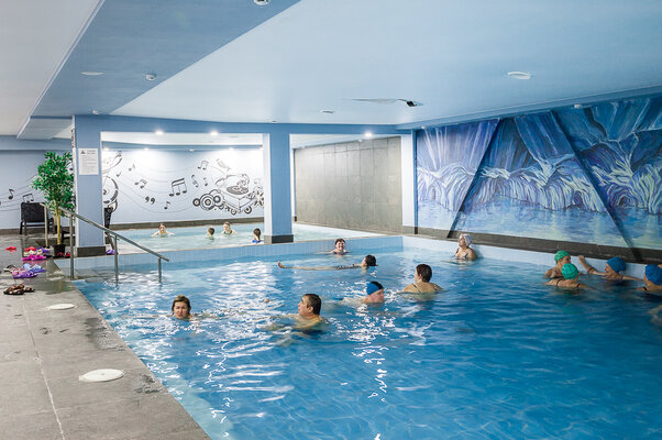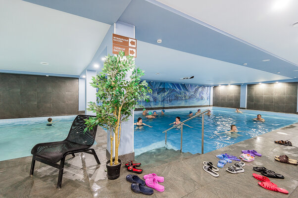 Температура воды комфортная, в бассейне работает множество водных аттракционов: массажеры, пушки, водопады.