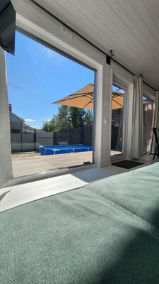 Гости могут насладиться освежающим купанием в бассейне в летнюю жару, а затем расслабиться в тени зонта или позагорать на удобных шезлонгах, расположенных на песчаном участке, напоминающем мини-пляж — идеальное место для отдыха и наслаждения солнечными днями.