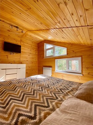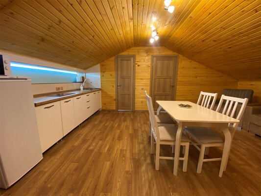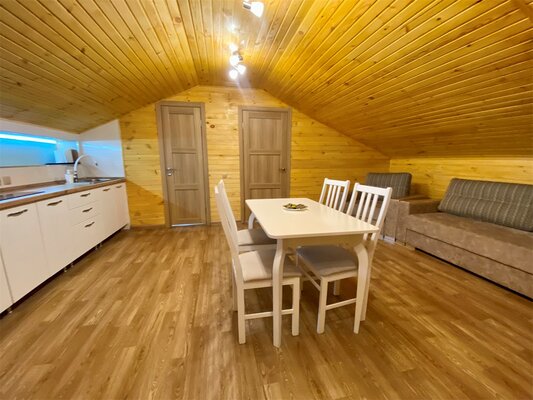 Баня расположена на острове и дарит гостям уникальную возможность сочетать приятное тепло парилки с освежающим плаванием летом и бодрящим погружением в зимнюю купель. Рядом оборудовано удобное пространство с деревянным столом и стульями, позволяющее расслабиться и насладиться живописными пейзажами местной природы.
