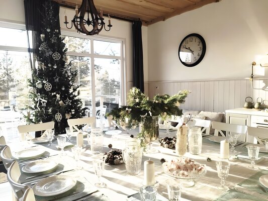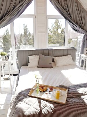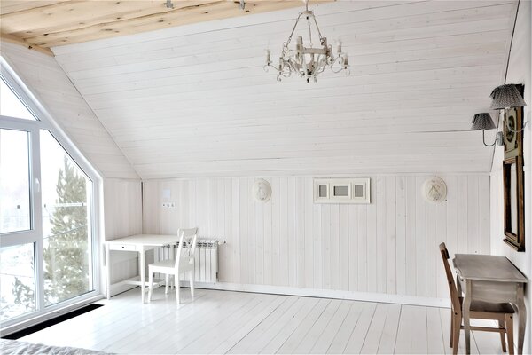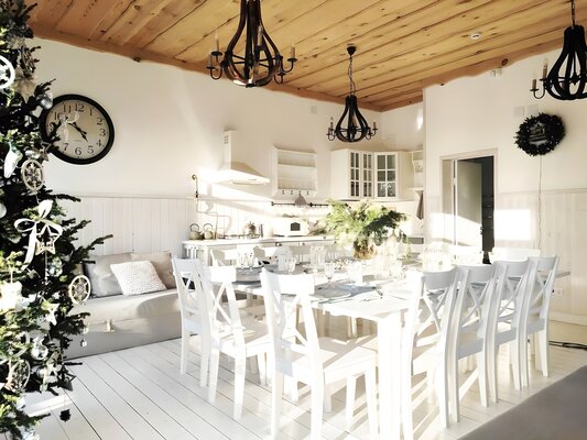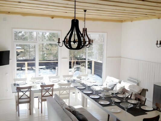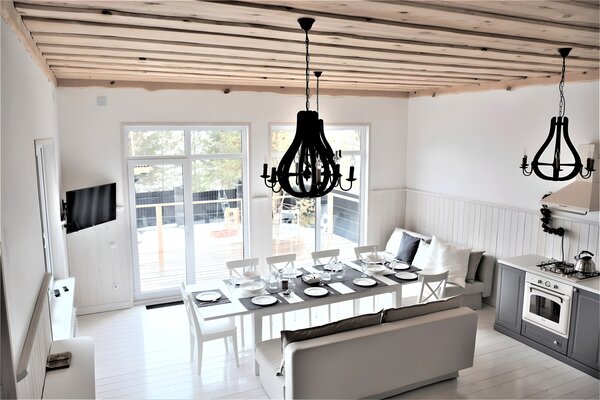 На закрытой и огороженной территории находится уютный дом в скандинавском стиле с элементами кантри. Белоснежный коттедж предлагает прекрасный вид на окружающие сосновые леса через панорамные окна гостиной и спален.