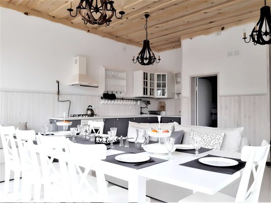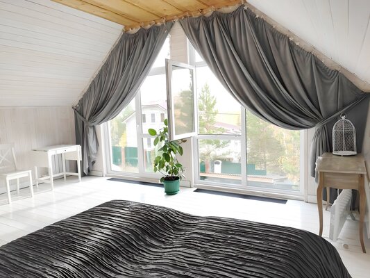 Первый этаж включает в себя просторный зал с двумя двуспальными диванами, ванную комнату и функциональную кухню. На втором этаже находятся две уютные спальни с двуспальными кроватями. На территории также есть мангальная зона, баня на дровах, уютная беседка и казан.