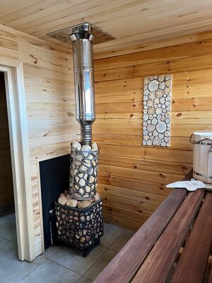 Банный чан, изготовленный из нержавеющей пищевой стали марки AISI 304. Изнутри чан обшит сибирской лиственницой. Вместимость до 8 человек.