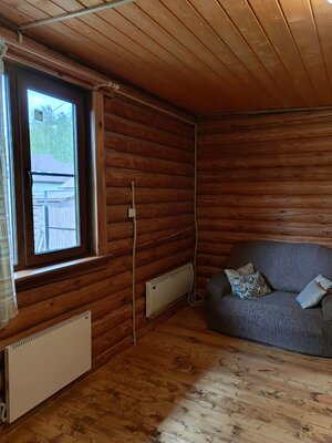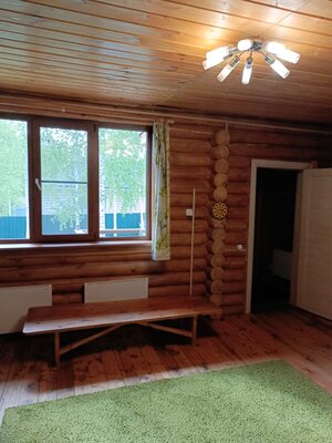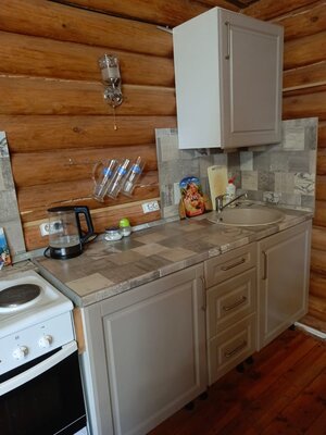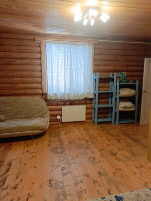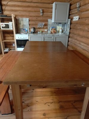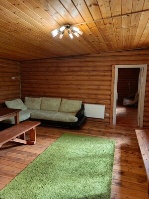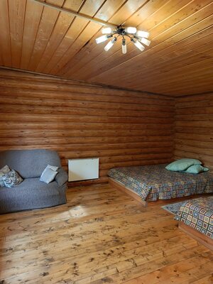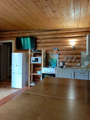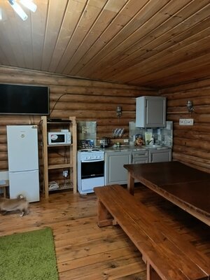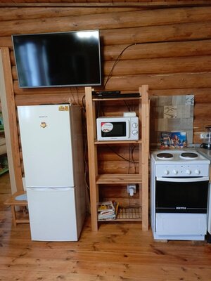 Просторный зал с кухней оборудован всем необходимым: большим обеденным столом, диваном, скамьями, телевизором, микроволновой печью, электроплитой с духовкой, полным набором посуды и электрочайником. Дополнительное спальное место — односпальный диван в зале.