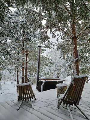 В глэмпинге два вида чанов — для домиков и для сафари-тентов. У каждого домика свой чан, топятся чаны к 8-9 вечера. По времени чан у домика горячий зимой 2-3 часа, летом дольше.