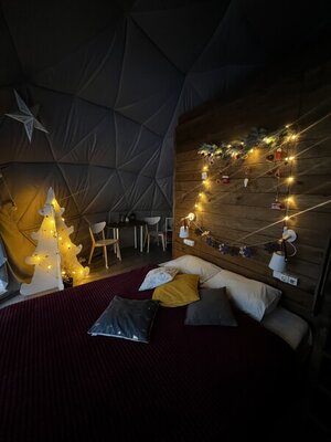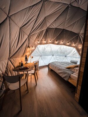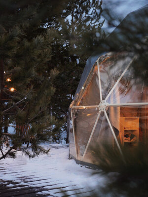 В глэмпинг можно приехать с воспитанными собаками (2 собаки в домик максимум, в купол 2 собаки мелких пород максимум).