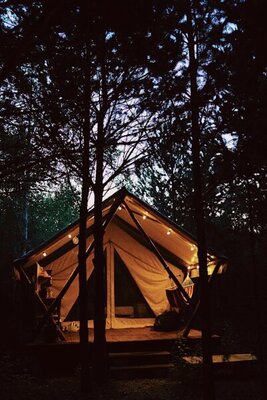- не оставлять его/её одного в шатре/домике — в незнакомом месте без хозяина даже самый спокойный питомец может занервничать — хотелось бы избежать последствий от громкого лая до порчи вещей (особенно москитных сеток в сафари-тентах, ремонт сетки в шатре обойдется примерно в 6000 ₽);