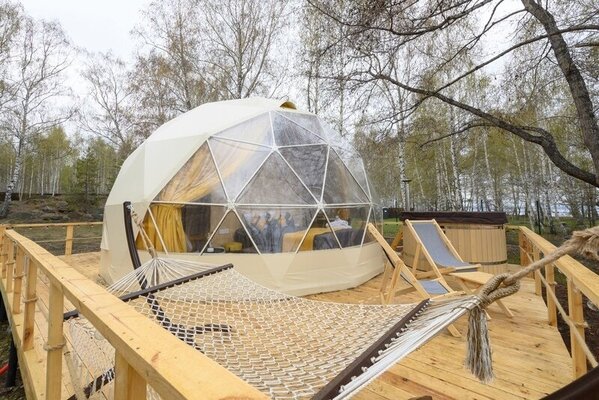 Территория глэмпинга — это оазис для отдыха и расслабления. Здесь вы найдете костровую зону для душевных вечеров, фотозону для запоминающихся снимков, уютный уголок у воды для наслаждения видами, оздоровительную русскую баню и панорамный гриль-купол, где можно приготовить блюда на свежем воздухе в компании до 12 человек. Юных гостей порадует обустроенная детская площадка.