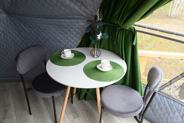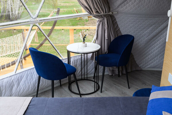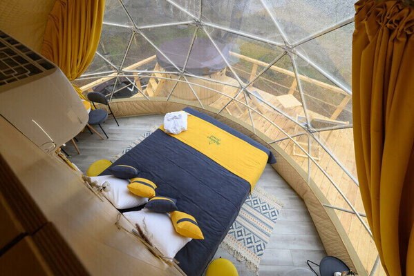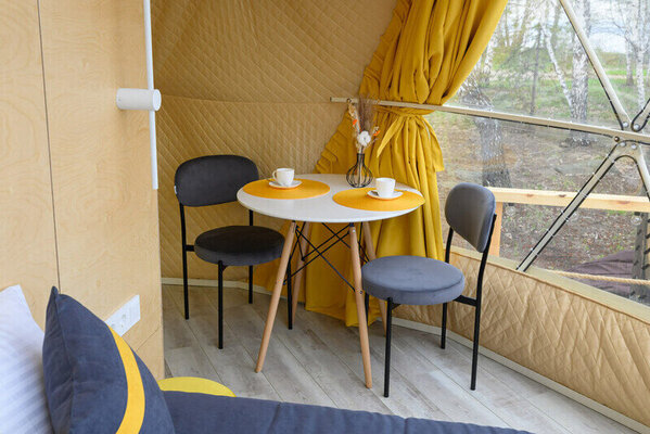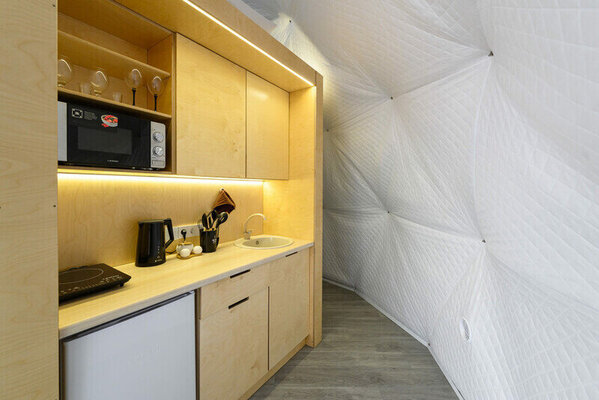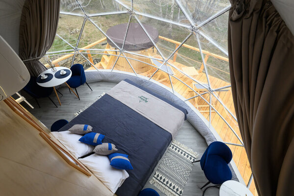 Интерьер сфер, вдохновленный драгоценными камнями, предлагает головокружительный панорамный вид на озеро и закаты. Теплые полы создают уютную атмосферу в любое время года, позволяя принимать гостей круглогодично. Каждая сфера оборудована частной ванной комнатой, туалетом, а также полотенцами и халатами. Кухни оснащены всем необходимым для приготовления и сервировки блюд.
