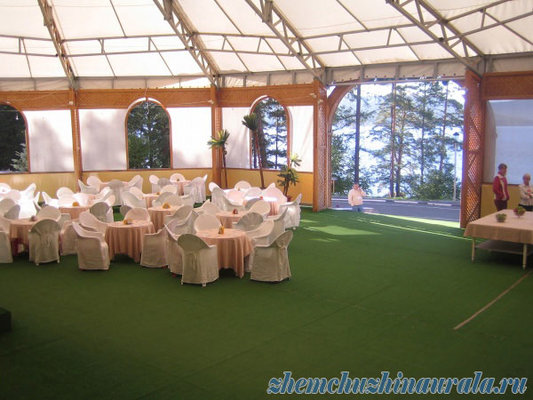 Летняя часть ресторана располагается на свежем воздухе. Деревянные столы, скамьи и льняные занавеси выглядят очень живописно на фоне озера Тургояк. Никакого шума машин, суеты и других напоминаний о городской жизни. Только лес, сосны, озеро, великолепный вид и идеально чистый воздух, время от времени наполняемый ароматами свежеприготовленных блюд на открытом огне. Приятно, сидя на свежем воздухе, в теплой дружеской компании попробовать разнообразные мясные блюда, свежие салаты, изысканные десерты от наших кондитеров. Все это не оставят Вас равнодушными.