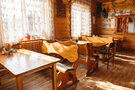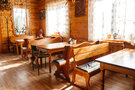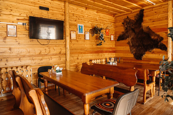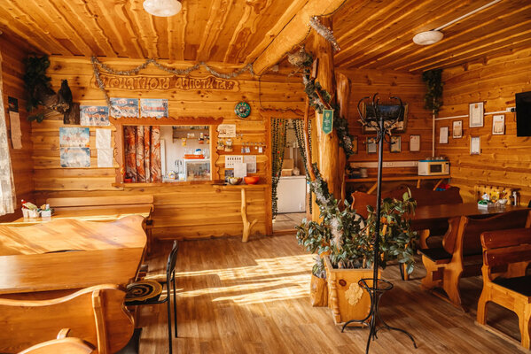 На территории работает кафе, выполненное в аутентичном стиле охотничьей избы и украшенное трофеями. В стоимость проживания включен сытный завтрак, а также двухразовое питание с возможностью выбора между обедом и ужином.