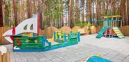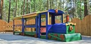 На территории базы рядом с центральной аллеей есть деревянная площадка «Лесной домик» предназначена для детей от 2 до 7 лет. Для ее создания использовали только натуральные природные материалы. На площадке представлены различные объекты: паровоз, мельница, башни с подвесными мостиками и горками, мостик через ручей, качели. Кроме активного отдыха на свежем воздухе, у вас есть возможность заняться и умственным развитием ребенка. Например, вспомнить, герои каких сказок встречают вас и ваших детей при входе на детскую площадку.