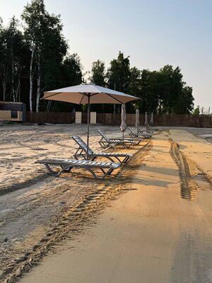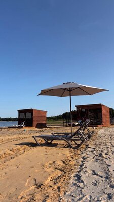 Песчаный берег озера Калды манит гостей своим безмятежным очарованием. Под зонтиками уютно расположились комфортабельные лежаки, которые приглашают отдыхающих насладиться теплом летних солнечных дней.
