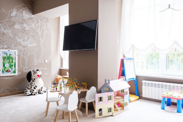 На первом этаже расположена уютная игровая зона для детей, где малыши могут наслаждаться играми и развлечениями в компании родителей.