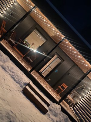 В бане вы найдете парную комнату с подсветкой, комнату отдыха с панорамными окнами и шезлонгами. В стоимость входят веники, эфирные масла, горный чай и полотенца, а также индивидуальный причал у озера. Минимальное бронирование бани — два часа.