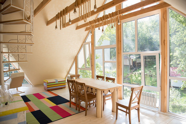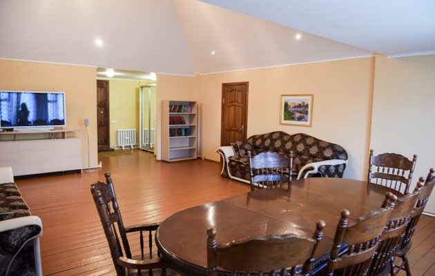 Зал оборудован столами, стульями, телевизором и выходом на отдельную мангальную площадку.