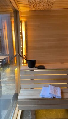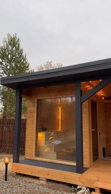 Спа Зона дома «Огонь» включает в себя горячую купель с гидромассажем, наполнением из грейпфрута и еловых веточек. Парную с панорамным видом на лес, пано из можжевельника, и светильниками из гималайской соли.