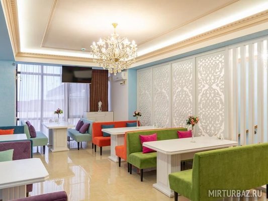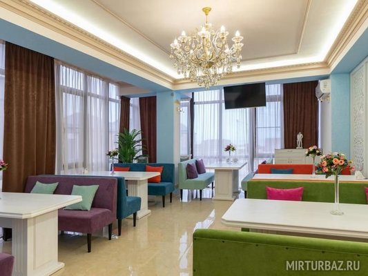 На третьем этаже гостиницы расположено семейное кафе под открытым небом с видом на зону отдыха с бассейном и шезлонгами, детскую площадку и побережье Каспийского моря.