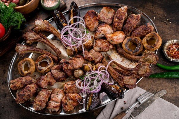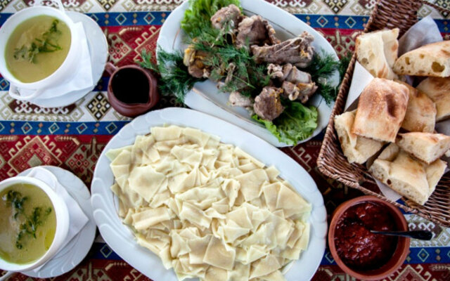 На ужин предлагаются блюда дагестанской кухни приготовленные, преимущественно из сезонных продуктов от местных ферм и производств, овощи и пряная зелень выращены на собственном огороде.