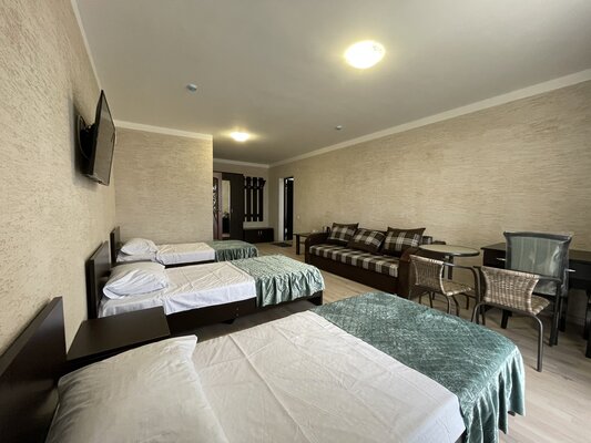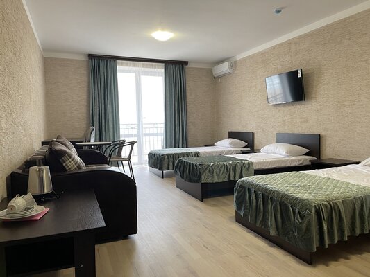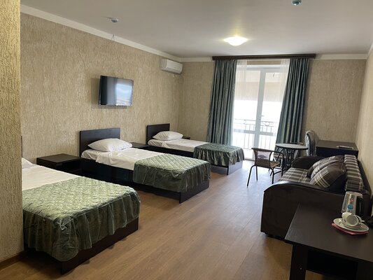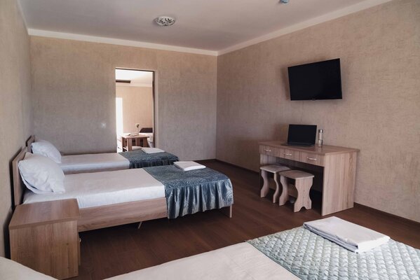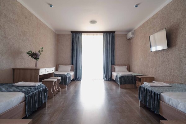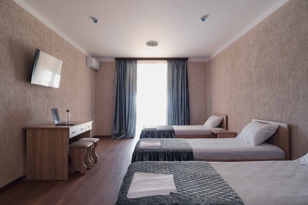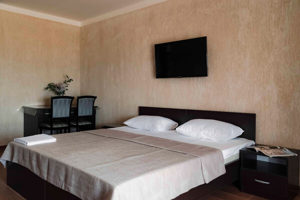 К услугам гостей 16 комфортабельных номеров на любой вкус, из окон каждого открывается захватывающий вид на море. В каждом номере созданы все условия для приятного отдыха: удобная мебель, кровати с ортопедическими матрасами, кондиционер, телевизор, холодильник и сейф.