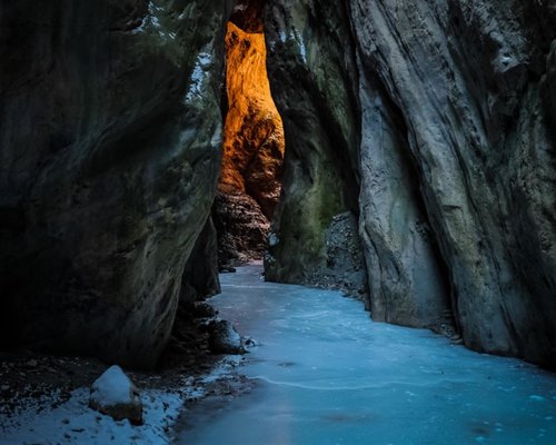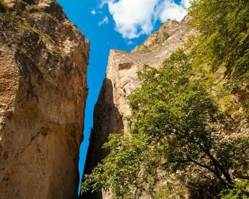 Уникальный памятник природы – узкий каньон высотой 170 метров при ширине не больше 2-4 метров напоминает сказочные ворота в затерянный мир. Карадахская теснина сформировалась благодаря реке Квартах, которая веками протачивала себе путь в горной толще. В дождливую погоду русло реки наполняется водой и превращается в бушующий поток. Скалы постепенно сужаются настолько, что остаётся совсем узкий проход, в который поступает очень мало света. Свет удивительно красиво играет на стенах теснины, переходя от теплых оттенков сверху к холодным всё ближе к земле.