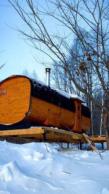 На территории глэмпинг-парка Манамур есть настоящая русская баня на дровах и купель под открытым небом.
