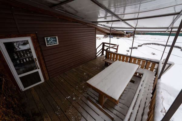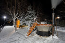 Возле бани обустроена просторная терраса, огромный чан с водой комфортной температуры. Особенно гостям нравится наслаждаться тёплой водой в зимние дни, когда на улице минус 20, минус 30, идет снег и получается яркий контраст температуры воздуха и воды в чане.