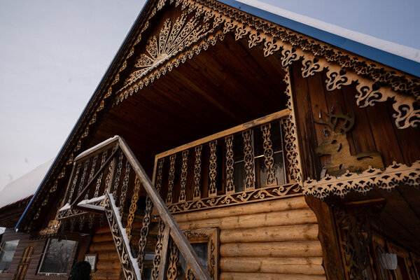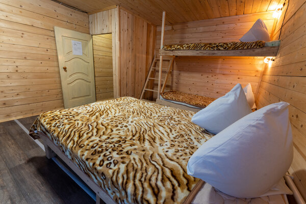 Гостиная — это большой рубленый бревенчатый дом вместимостью до 60 человек. Он сделан из огромных бревен в таёжно-охотничьем стиле, украшен шкурами диких зверей.