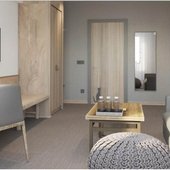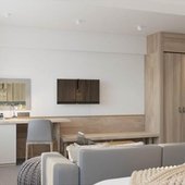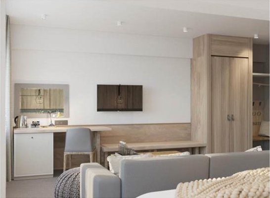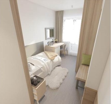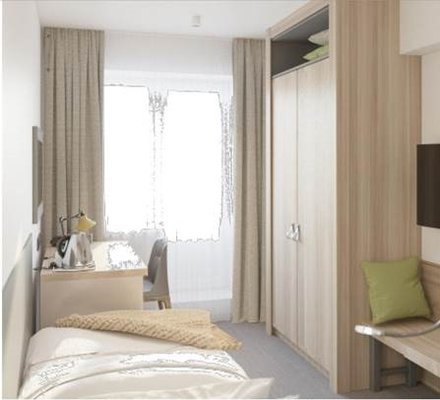 В числе удобств каждого оформленного в ярких тонах номера — письменный стол, полотенца и постельное белье.