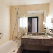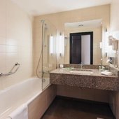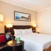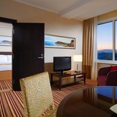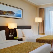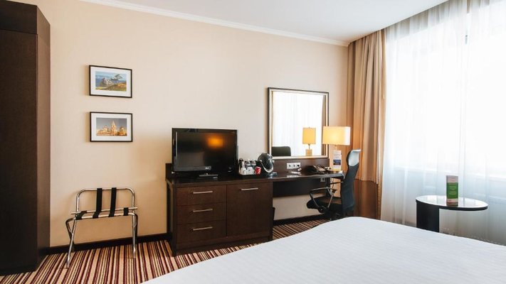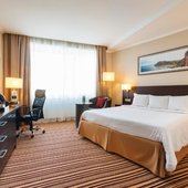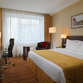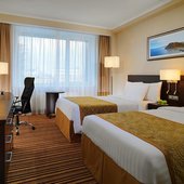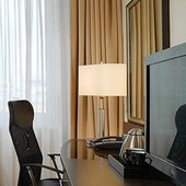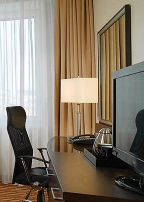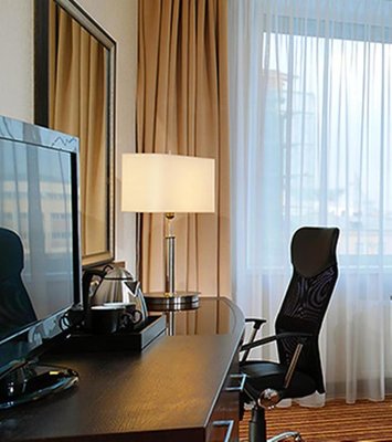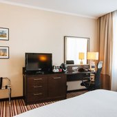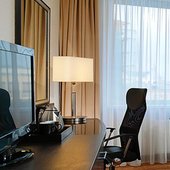 В числе удобств номеров отеля «Кортъярд Марриотт Иркутск Сити Центр» — большие окна, мебель из темного дерева, принадлежности для чая/кофе, мини-холодильник и сейф.
