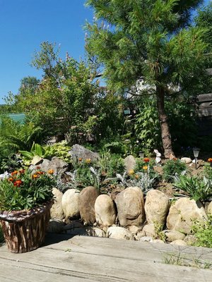 На территории есть большая лужайка с естественным газоном, летом превращается в поле клевера, одуванчиков или подорожника. Раздолье для детей и взрослых, любящих бегать босиком по траве.