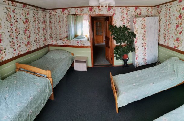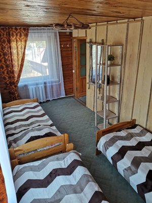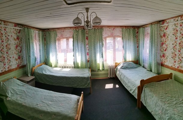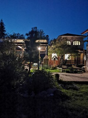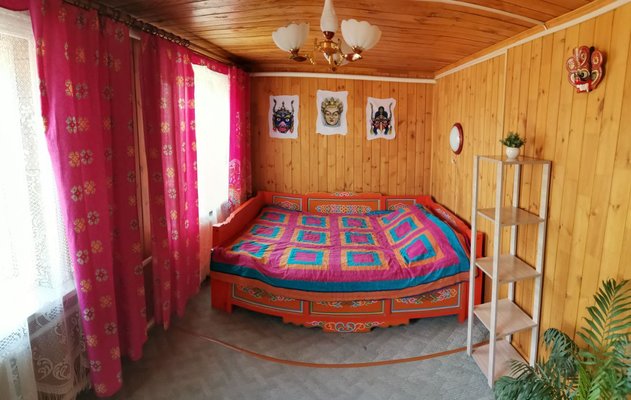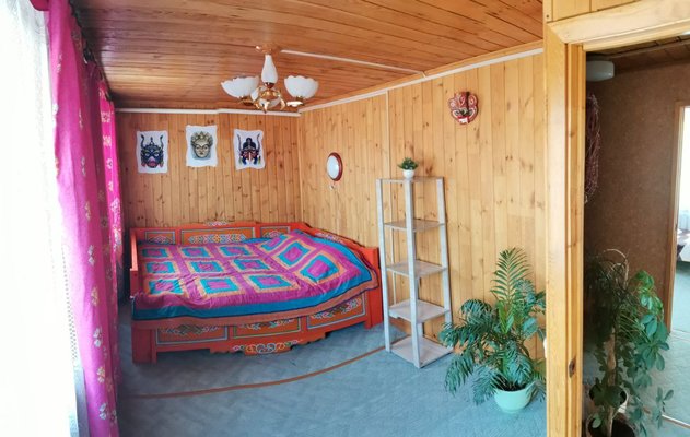 В деревянном коттедже есть 4 спальни, из окон которых открывается потрясающий вид на снежные горы. Также здесь есть большая столовая, каминный зал, кухня, душ и два туалета. Комфортно отдохнуть компанией можно не больше чем 20 человек. Для полного релакса гостей доступна жаркая банька, беседка, мангал, и коптилка для рыбы. Зимой здесь оберегают белые сугробы, строят детскую горку и заливают каток. А летом здесь устанавливают большой бассейн для взрослых и маленький для детей, а также ухаживают за поляной с одуванчиками.