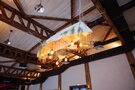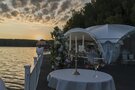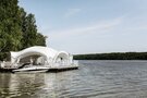 Шатер расположен непосредственно над водной гладью. Внутренняя часть шатра украшена декоративной тканью. Две великолепные люстры обеспечивают комфортное освещение в темное время суток. Имеется концертное освещение.