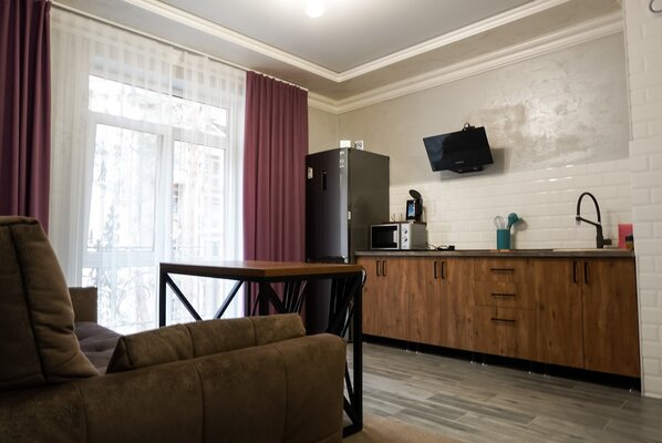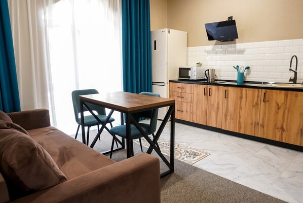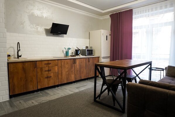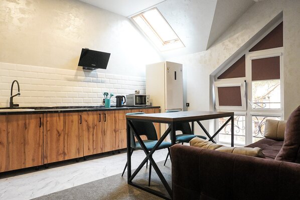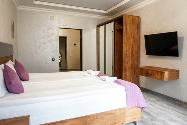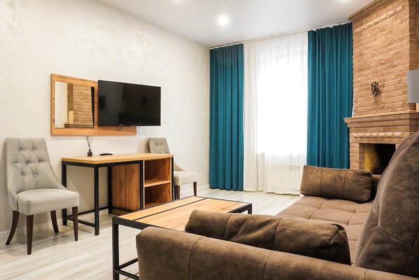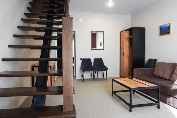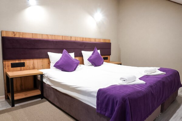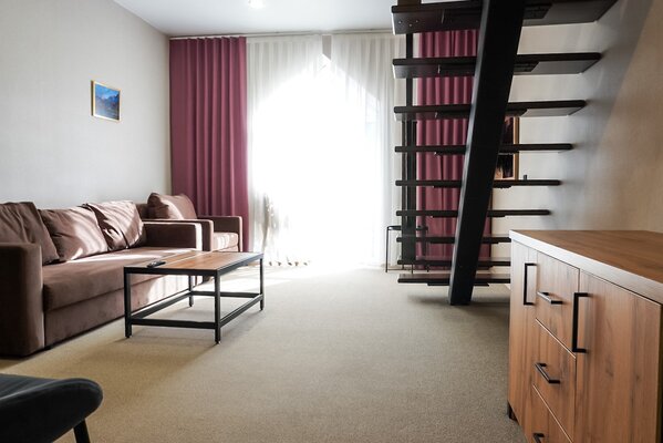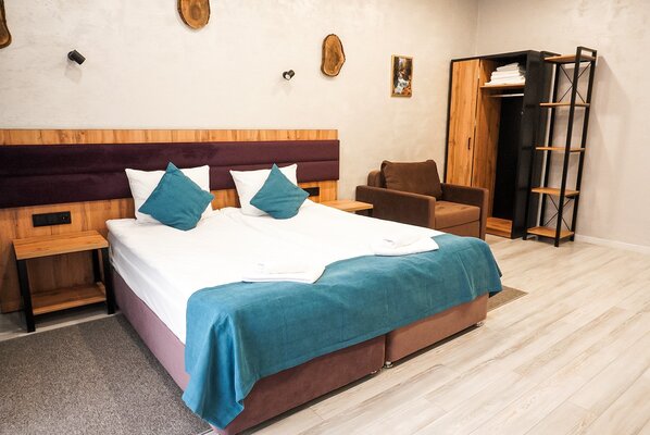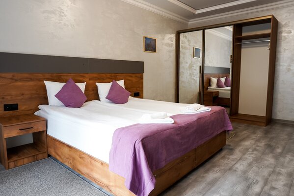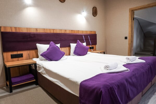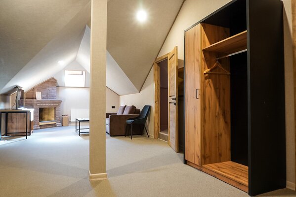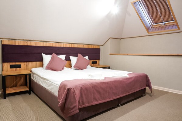 В Eco Village вас ждет 14 комфортабельных номеров: от уютных «Стандартов» на цокольном этаже до просторных двухэтажных «Апартаментов» площадью 150 м² с тремя спальнями, камином и ванной под мансардным окном.