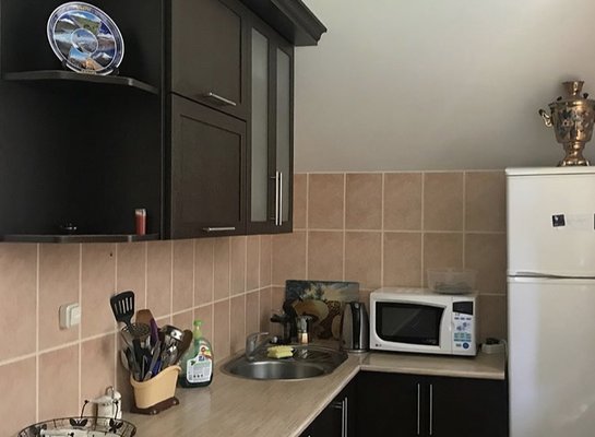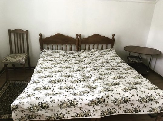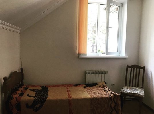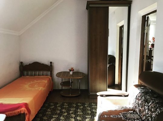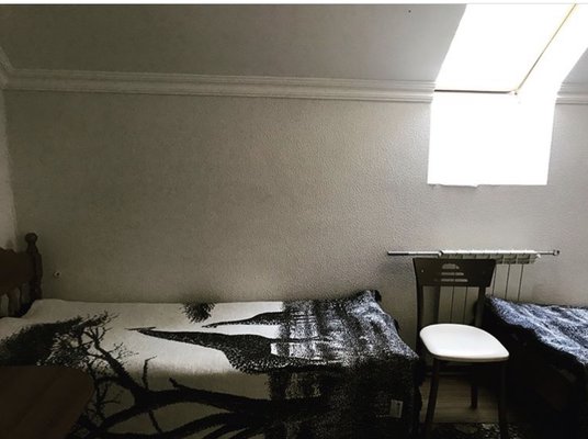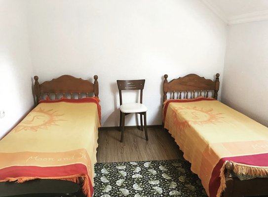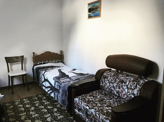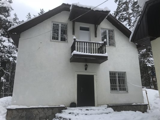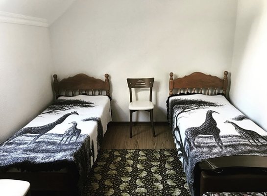 Это двухэтажный коттедж, в километре от полян Чегет и Азау, оборудованный всеми удобствами: Wi-Fi, горячая вода, телевизор, мебель, кухня. Проживать могут до 18 гостей.