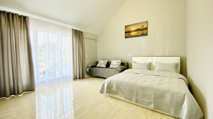 Просторный комфортабельный дом на Куршской косе, идеально подходящий для отдыха большой компании или проведения мероприятий. В вашем распоряжении 9 уютных изолированных номеров с двуспальными кроватями, диванами, собственными ванными комнатами и всем необходимым для комфортного проживания: холодильником, микроволновой печью, чайником, посудой и телевизором.