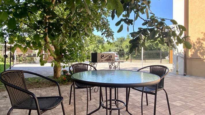 Дом расположен на закрытой территории с парковкой (7+ мест), тремя мангалами и уличными столиками под навесом. Море в 10 минутах ходьбы, продуктовый магазин — в соседнем доме.