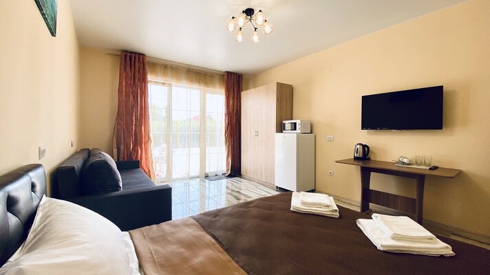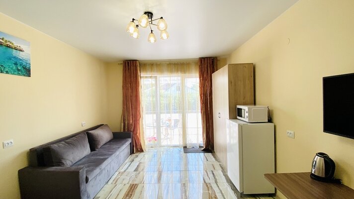 Уютный номер на первом этаже с отдельным входом в двухэтажном доме. Светлая комната с новой мебелью и современной техникой (ТВ, чайник, холодильник, микроволновка, посуда, фен) оснащена кондиционером и собственной ванной комнатой.