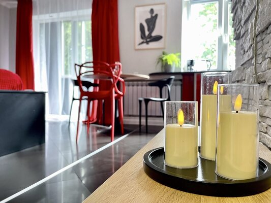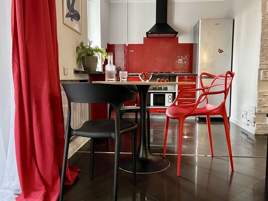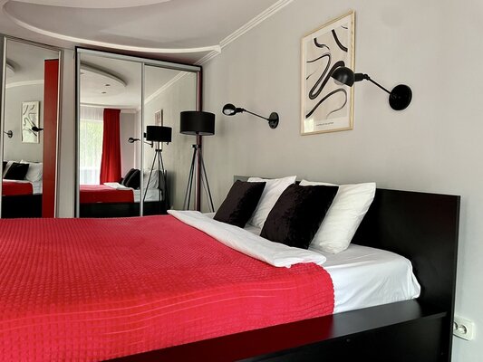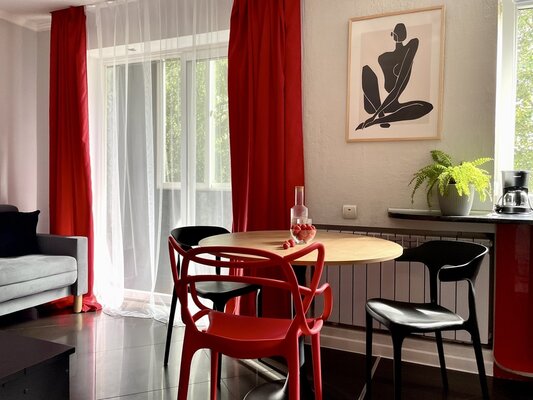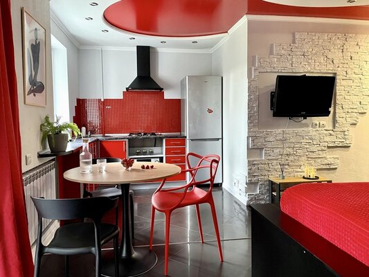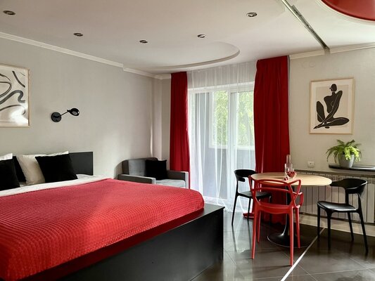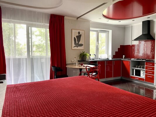 Стильная студия в центре Калининграда с современным ремонтом, полностью меблирована и оборудована всей необходимой техникой. К вашим услугам: ЖК-телевизор с кабельными каналами, высокоскоростной Wi-Fi, постельное белье, полотенца и туалетные принадлежности. На полностью оборудованной кухне вы найдете микроволновую печь, холодильник, плиту и всю необходимую посуду. Спокойный отдых обеспечен благодаря тихому внутреннему дворику, на который выходят окна и балкон студии.